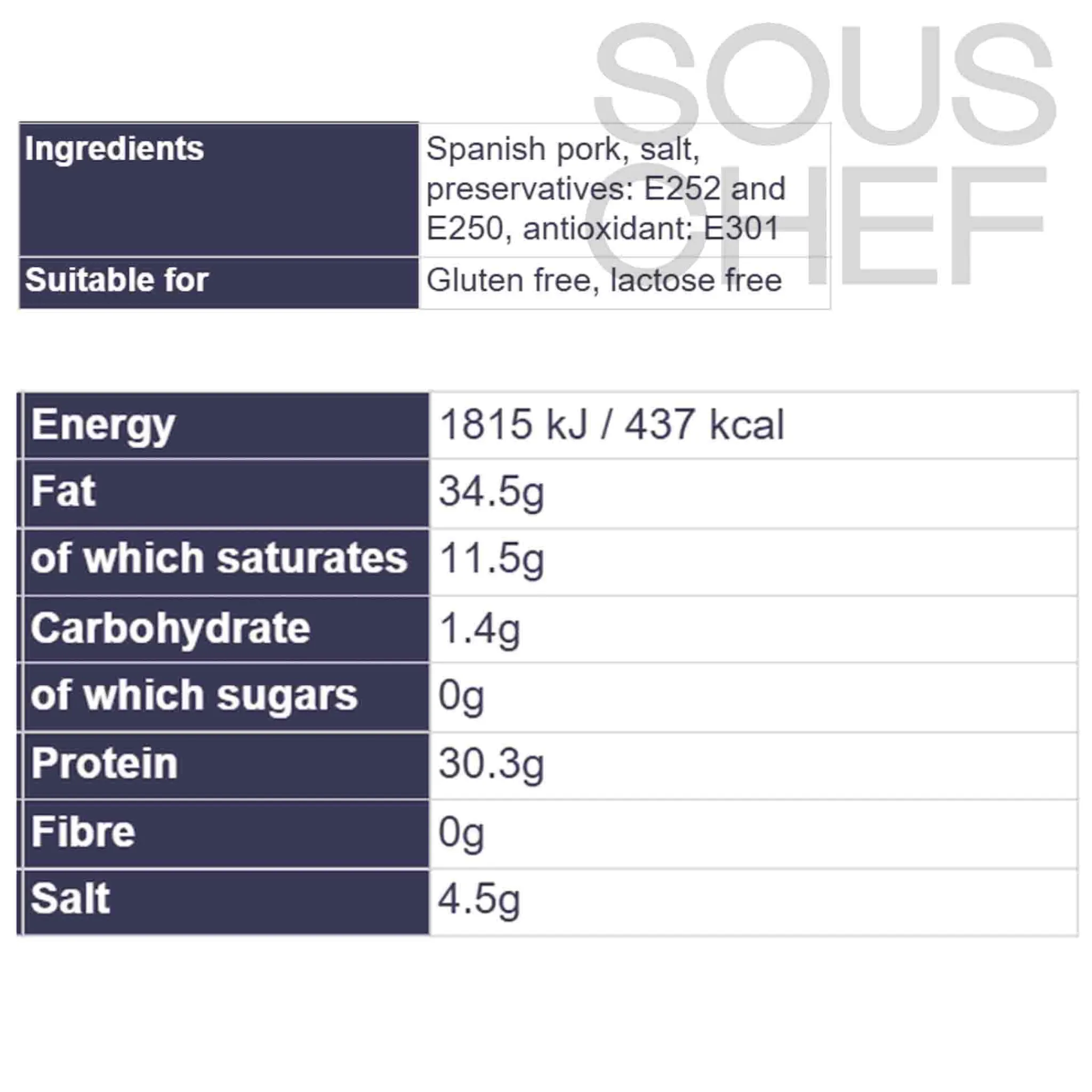 Product formulations and details may change. For the latest ingredients and allergen information always check product packaging prior to consumption. Ingredients: Spanish pork, salt, preservatives: e252 and e250, antioxidant: e301