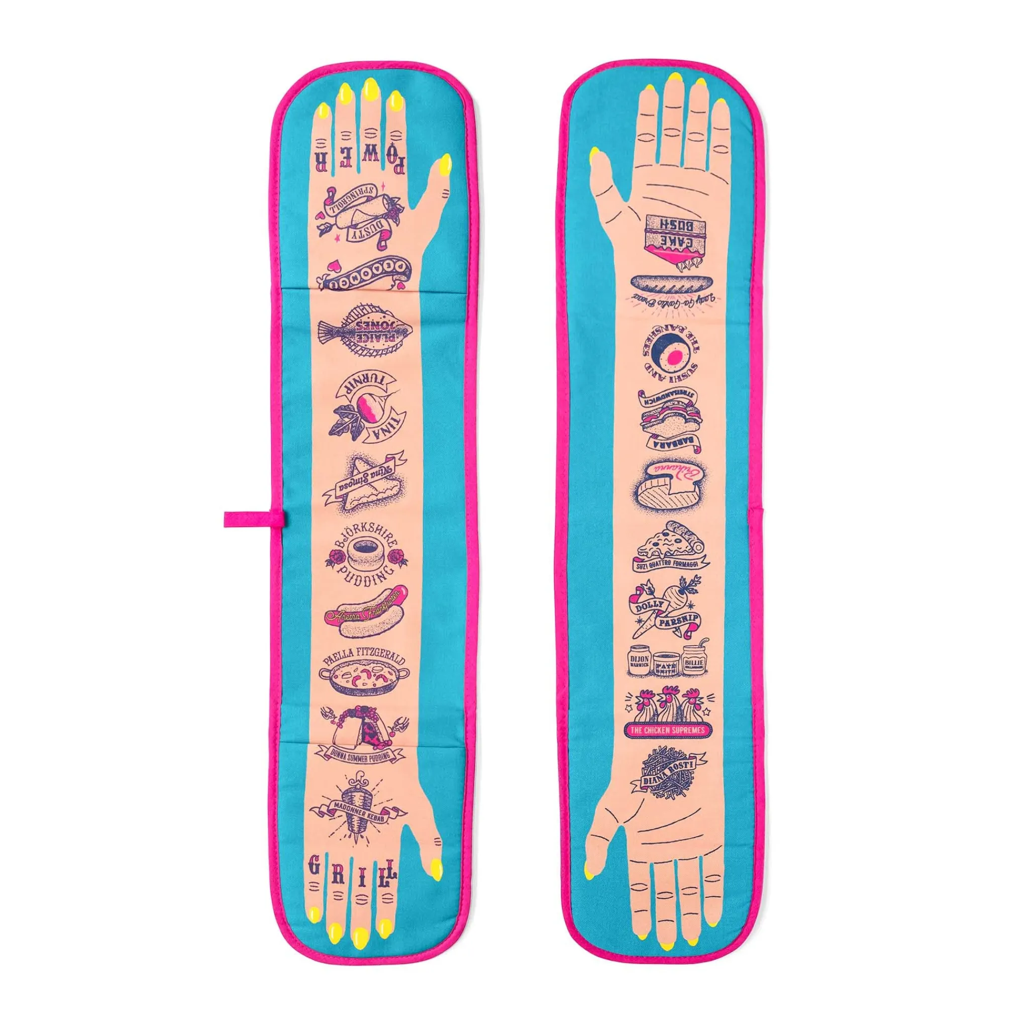 Stuart Gardiner’s ‘Grill Power’ double oven glove celebrates iconic women musicians, with a fun, foodie twist. Featuring tattoos from Dusty Springroll to Björkshire Puddings – this bright blue and pink oven glove is perfect for anyone who loves music as much as food. It’s just the thing to wear as you serve up your Madonna kebabs!