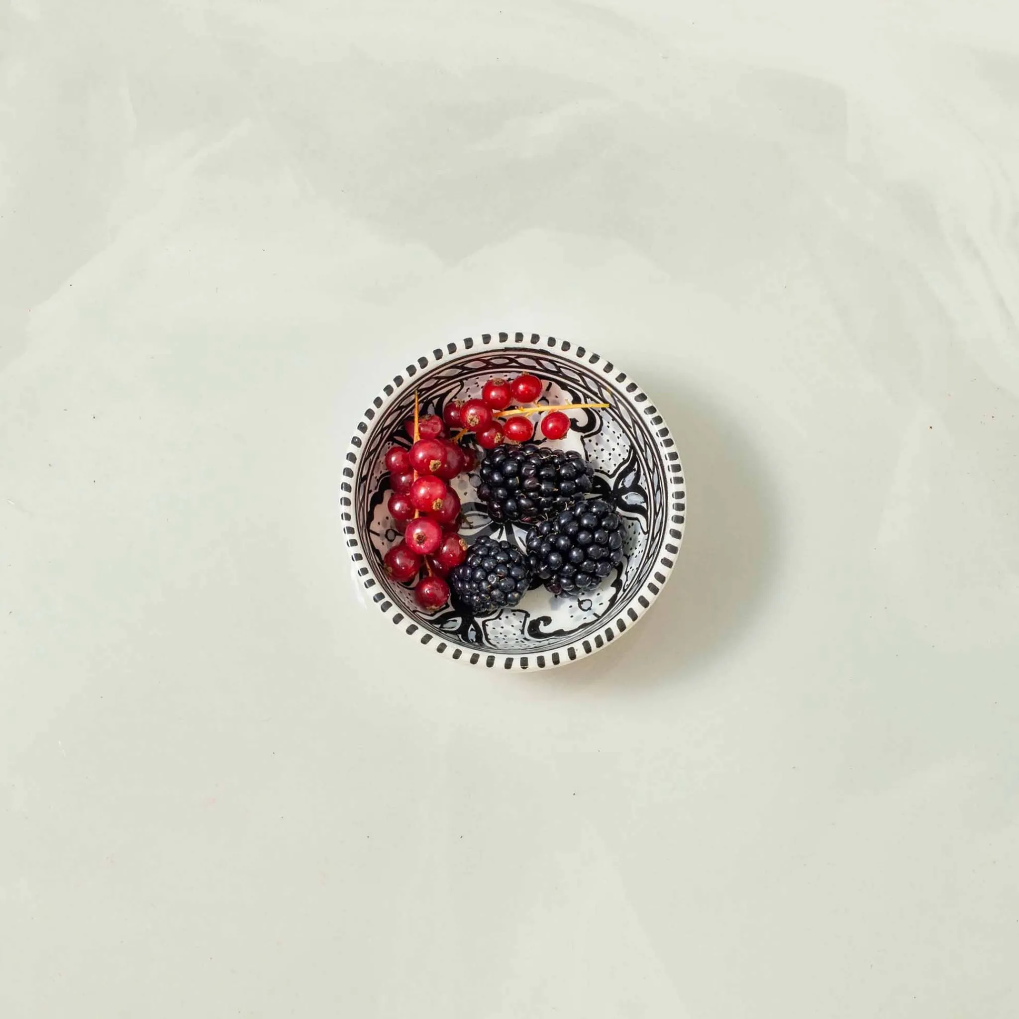 The alyasamin patterned sauce dish is a smart way to serve creamy hummus, punchy harissa or black olive tapenade. Each small bowl is adorned with abstract patterns in deep hues of grey and black, making it a striking addition to every table. As well as using this bowl for sauces and dips, fill it with olives and almonds at your next dinner party.
