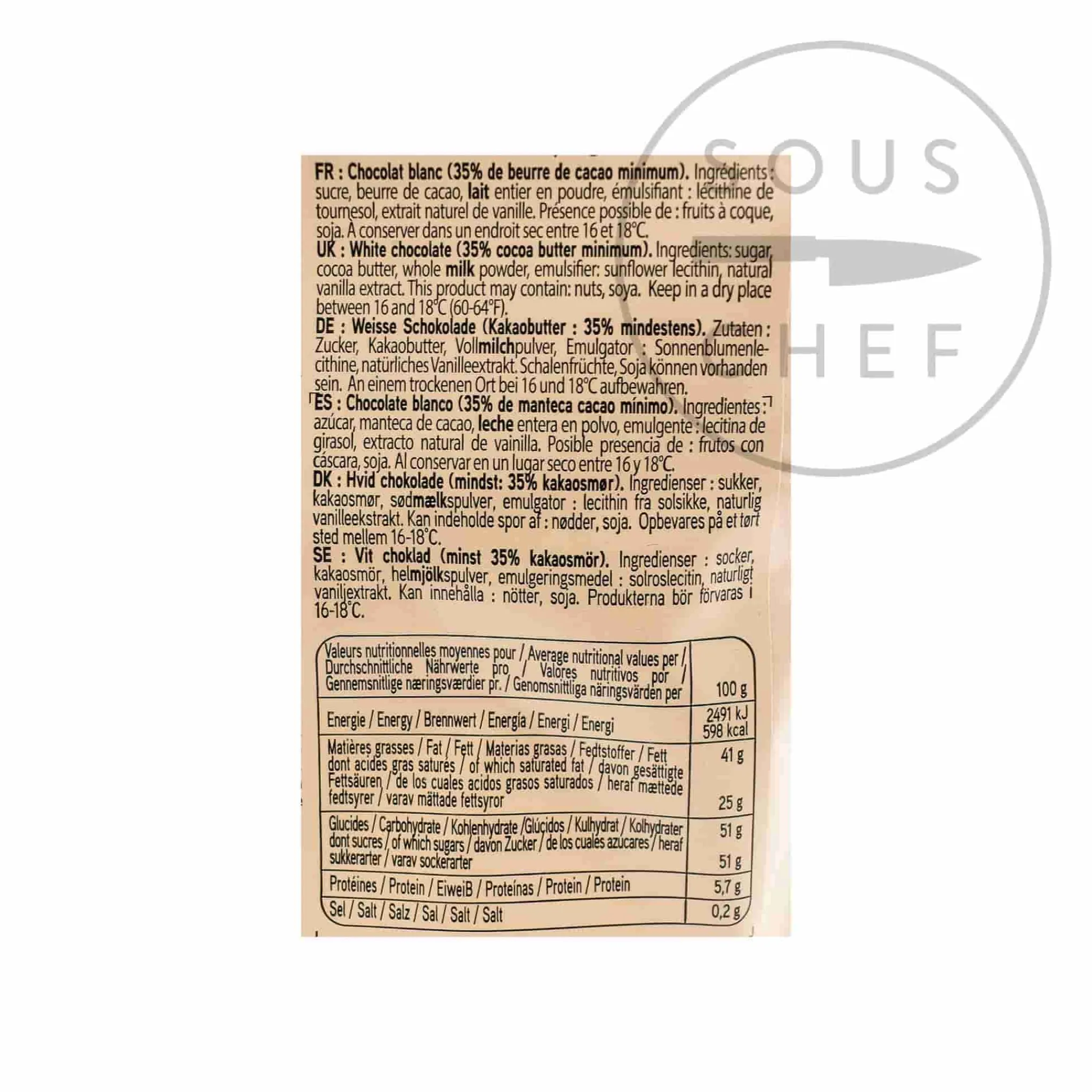 Valrhona ivoire contains a minimum of 35% cocoa butter which helps the chocolate melt and flow in baking, and gives the white chocolate its creamy taste. The individually moulded chocolate chips are easy to weigh out and very quick to melt with their trademark Valrhona feves or bean shape.