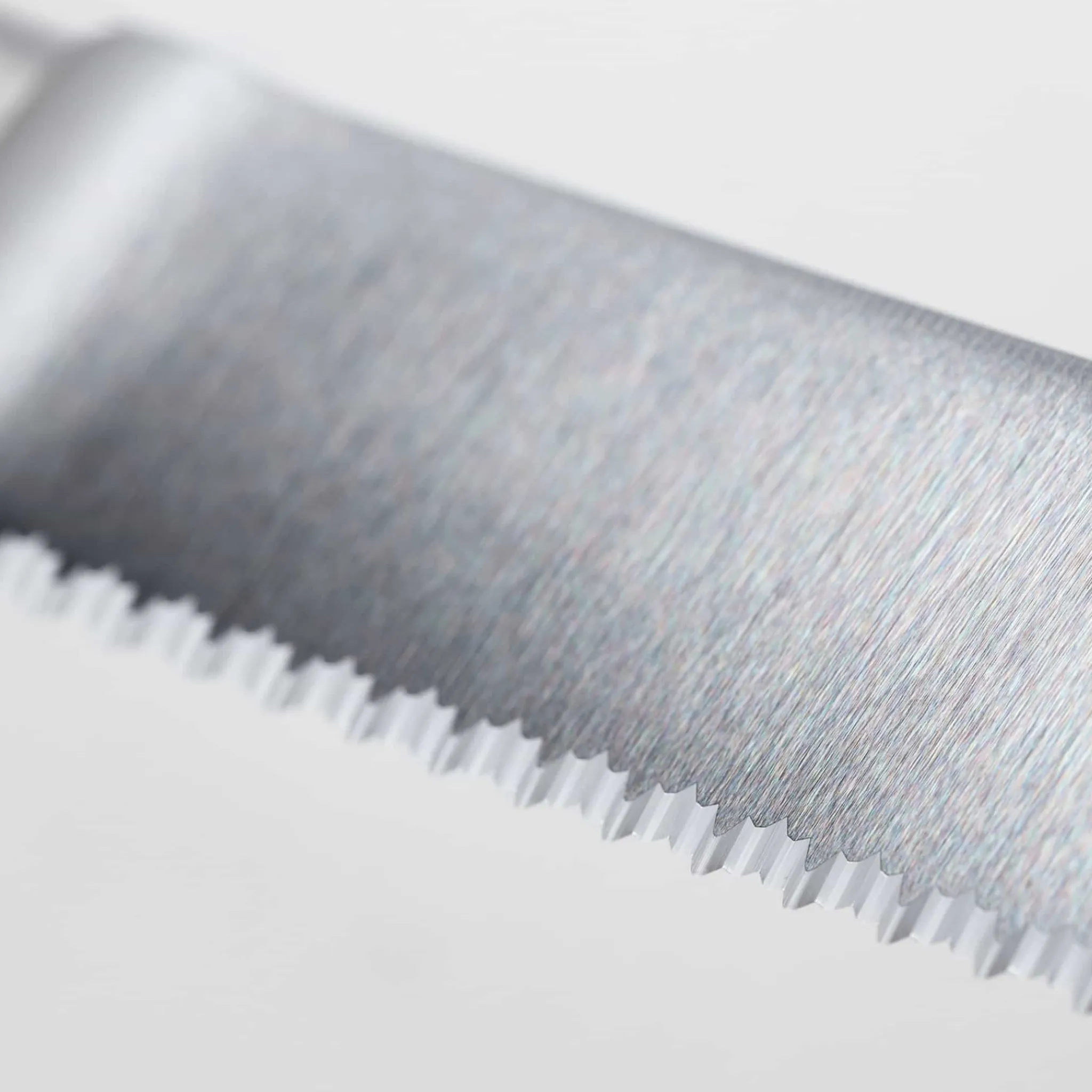 The Wusthof Ikon Precision Bread Knife is meticulously crafted to redefine your slicing experience. With its precise, double-serrated edge, this knife sets itself apart—featuring serrations within serrations, it maintains sharpness for longer durations, requiring less pressure for impeccably smooth cuts.